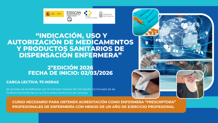 Acción formativa organizada por la Escuela de Servicios Sanitarios y Sociales de Canarias (ESSSCAN) en colaboración con la Dirección General de Programas Asistenciales de la Consejería de Sanidad del Gobierno de Canarias y dirigida a Profesionales de Enfermería de la Comunidad Autónoma de Canarias para ser habilitados como "Enfermeros prescriptores".