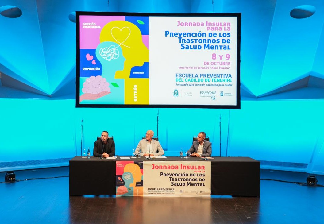 El director del Servicio Canario de la Salud (SCS), Adasat Goya, acompañado por el consejero delegado de Educación para la Prevención del Cabildo, Juan Acosta, y el director de la Escuela de Servicios Sanitarios de Canarias (ESSSCAN), José Montelongo, participó este miércoles, 8 de octubre, en el acto inaugural de la Jornada Insular para la Prevención de los Trastornos de Salud Mental en Tenerife, actividad organizada por la Escuela de Servicios Sanitarios y Sociales de Canarias (ESSSCAN), dependiente de la Consejería de Sanidad del Gobierno de Canarias, en colaboración con la Consejería de Educación para la Prevención del Cabildo Insular de Tenerife, en el marco de la Escuela Preventiva y su Itinerario Formativo Insular 2025.